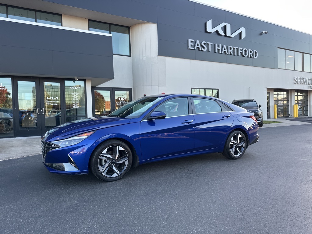 2022 Hyundai Elantra Limited embodies modern sophistication, advanced safety, and impressive efficiency in a stylish compact sedan built to exceed expectations. Finished in striking Intense Blue with a refined Black leather-trimmed interior, this one-owner vehicle combines contemporary design with premium amenities, making it a standout choice for drivers seeking both comfort and cutting-edge technology. With bold exterior lines, a distinctive grille, and 17-inch alloy wheels, the Elantra Limited showcases Hyundais dynamic design language while maintaining a sleek, aerodynamic silhouette.Under the hood, the Elantra Limited is powered by Hyundais Smartstream 2.0L DOHC 4-cylinder engine with Dual Continuous Variable Valve Timing, paired with an Intelligent Variable Transmission for a smooth, responsive ride. Delivering an EPA-estimated 31 MPG city and 41 MPG highway, this advanced powertrain balances spirited performance with remarkable efficiency. Four-wheel disc brakes and a finely tuned suspension system provide precise handling and confident control, while features like the Electronic Parking Brake with Automatic Vehicle Hold enhance convenience during daily driving.Inside, the cabin of the 2022 Elantra Limited is designed around driver comfort and intuitive technology. The 10.25-inch touchscreen navigation system integrates seamlessly with Apple CarPlay and Android Auto, while a matching 10.25-inch digital instrument cluster provides real-time driving information with clarity and style. The Bose premium audio system with eight speakers and subwoofer transforms the interior into a concert-like sound space, while leather-trimmed, heated front seats, dual-zone automatic climate control, and a power drivers seat with lumbar support ensure every journey is both comfortable and refined. Additional premium touches such as an auto-dimming rearview mirror, wireless charging pad, proximity key with push-button start, and hands-free smart trunk release elevate the driving experience even further.The 2022 Elantra Limited offers one of the most comprehensive safety suites in its class. Hyundai SmartSense technology includes Forward Collision-Avoidance Assist with Pedestrian, Cyclist, and Junction-Turning Detection; Blind-Spot Collision-Avoidance Assist; Rear Cross-Traffic Collision-Avoidance Assist; Lane Keeping and Lane Following Assist; and Highway Driving Assist. Advanced systems like Smart Cruise Control with Stop & Go, Parking Collision-Avoidance Assist, and Driver Attention Warning bring an extra layer of confidence to every drive. The Rearview Camera with Dynamic Guidelines makes tight spaces easier to navigate, while a reinforced frame design and multiple airbags enhance occupant protection.The Elantra Limiteds modern exterior reflects both elegance and purpose. The power sunroof, LED headlights with automatic high-beam assist, and heated side mirrors with integrated turn indicators combine practicality with style. Sculpted body panels, chrome accents, and a confident stance give it a premium appearance usually reserved for higher-end sedans. Every detailfrom the aerodynamic roofline to the bold character linesreflects Hyundais commitment to design excellence and performance efficiency.With its blend of technology, luxury, and intelligent engineering, the 2022 Hyundai Elantra Limited is more than just a sedanits a statement of innovation and refinement. Designed to deliver premium features, exceptional safety, and impressive fuel economy, it stands as one of the most advanced vehicles in its segment. Whether navigating the city or cruising the open highway, the Elantra Limited provides an experience thats as intelligent as it is inspiring.We are a Dobbs Automotive Company with over 100 years of experience. Kia of East Hartford is the source for all makes and models. www.kiaeast.com.