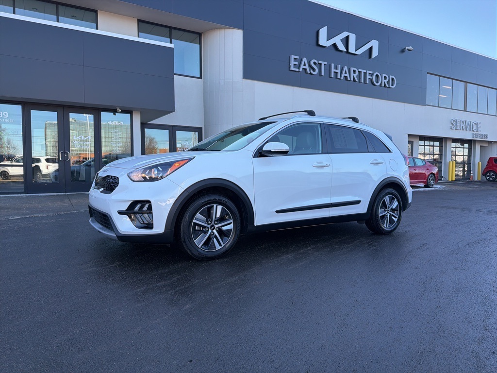 2022 Kia Niro EX Premium is a highly efficient and well-equipped hybrid crossover that delivers exceptional fuel economy, advanced technology, and premium comfort in a compact and practical design. Engineered for drivers who value efficiency without sacrificing refinement, the 2022 Kia Niro EX Premium stands out as one of the most desirable hybrid SUVs in its class, offering smooth performance, modern styling, and an elevated driving experience.This 2022 Kia Niro EX Premium is finished in the highly sought-after Snow White Pearl exterior paired with a Light Gray interior, a clean and modern color combination that enhances both visual appeal and long-term desirability. Known for outstanding reliability and class-leading efficiency, the Kia Niro Hybrid continues to be a top choice for commuters and environmentally conscious drivers seeking a stylish and versatile vehicle. With impressive fuel economy ratings and a reputation for low operating costs, the Niro EX Premium remains one of the most searched-for hybrid crossovers in todays market.Key features of the 2022 Kia Niro EX Premium include a 1.6L Atkinson Cycle 4-cylinder hybrid engine paired with a 6-speed automatic dual-clutch transmission, delivering smooth acceleration and outstanding efficiency with an estimated 51 MPG city and 46 MPG highway. Safety and driver-assist technologies are extensive and include Forward Collision-Avoidance Assist, Blind Spot Collision Warning, Rear Cross-Traffic Collision Warning, Lane Following Assist, Driver Monitoring Alert, rear parking sensors, and a rear view back-up camera. The interior is equipped with premium amenities such as heated and ventilated front bucket seats, a heated leather-wrapped steering wheel, dual-zone automatic climate control, navigation with voice activation, adaptive smart cruise control with stop-and-go functionality, and an advanced driver information display. Exterior highlights include LED brake lights, front fog lamps, automatic high-beam headlights, roof rack rails, chrome exterior accents, alloy wheels, and a power sliding glass sunroof that enhances both comfort and style.Additional equipment on this 2022 Kia Niro EX Premium includes SynTex-trimmed seating surfaces, carpeted floor mats, a cargo net, a premium AM/FM/HD/SiriusXM audio system with multiple speakers, Bluetooth connectivity, integrated navigation, and regenerative braking technology for improved efficiency. The hybrid system is supported by a lithium-ion-polymer battery and multiple selectable drive modes designed to optimize performance and fuel savings in a variety of driving conditions.Overall, the 2022 Kia Niro EX Premium delivers an exceptional blend of efficiency, advanced safety technology, premium comfort, and everyday versatility. With its desirable color combination, high-end features, and outstanding hybrid performance, this Kia Niro EX Premium is an excellent choice for drivers seeking a dependable and fuel-efficient crossover with modern amenities and strong resale appeal. We are a Dobbs Automotive Company with over 100 years of experience. Kia of East Hartford is the source for all makes and models. www.kiaeast.com.