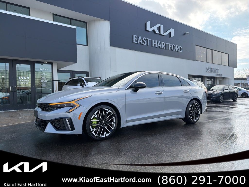 2025 Kia K5 GT is a bold and performance-driven midsize sedan that blends aggressive styling, turbocharged power, and advanced technology into a package designed for drivers who want excitement without sacrificing everyday comfort. Finished in striking Wolf Gray with a Black interior, this K5 GT stands out with a confident road presence, athletic proportions, and a sport-focused design that makes it one of the most compelling sport sedans in its class.This particular 2025 Kia K5 GT benefits from a highly desirable Wolf Gray exterior paired with a Black interior, a color combination that continues to be one of the most searched and requested among performance-oriented Kia shoppers. The GT trim elevates the K5 lineup with a powerful 2.5L turbocharged engine, sport-tuned suspension, and an 8-speed dual clutch transmission with paddle shifters, delivering quick acceleration and engaging driving dynamics. Front-wheel drive keeps the experience responsive and efficient, while the GT-specific styling cues reinforce its performance intent.Safety and driver assistance technology are central to the 2025 Kia K5 GT, featuring Forward Collision-Avoidance Assist with pedestrian, cyclist, and junction turning detection, Blind-Spot Collision-Avoidance Assist, Rear Cross-Traffic Collision Avoidance, Highway Driving Assist, Smart Cruise Control with Stop and Go, Driver Monitoring alerts, and a full array of advanced airbags. These systems work together to enhance confidence and awareness in daily driving and highway cruising. Exterior features include 19-inch gloss black machined alloy wheels, LED lighting with automatic high beams, front fog lamps, a metal-look grille, perimeter approach lighting, and a power sunroof that adds light and openness to the cabin.Inside, the 2025 Kia K5 GT offers a refined yet sporty environment with heated sport bucket seats trimmed in SynTex, a leather-wrapped sport steering wheel, dual-zone automatic climate control, and premium interior accents with piano black and metal-look finishes. The driver-focused cockpit features a 12.3-inch touchscreen display with built-in navigation, wireless Apple CarPlay and Android Auto, Bluetooth connectivity, HD Radio, satellite radio capability, and voice recognition. Additional conveniences include smart key access with proximity trunk release, folding rear seats for added cargo flexibility, ambient interior lighting, and multiple power outlets to keep devices charged on the go.Optional and added equipment on this K5 GT includes the upgraded 19-inch alloy wheels, heated front seats, carpeted floor mats, wheel locks, and the signature Wolf Gray paint, further enhancing both style and functionality. Every detail of the 2025 Kia K5 GT has been engineered to deliver a balance of performance, technology, comfort, and bold design, making it an excellent choice for drivers seeking a modern sport sedan with everyday usability.The 2025 Kia K5 GT represents a standout combination of turbocharged performance, advanced safety technology, and head-turning design, offering a driving experience that is as engaging as it is refined. We are a Dobbs Automotive Company with over 100 years of experience. Kia of East Hartford is the source for all makes and models. www.kiaeast.com.